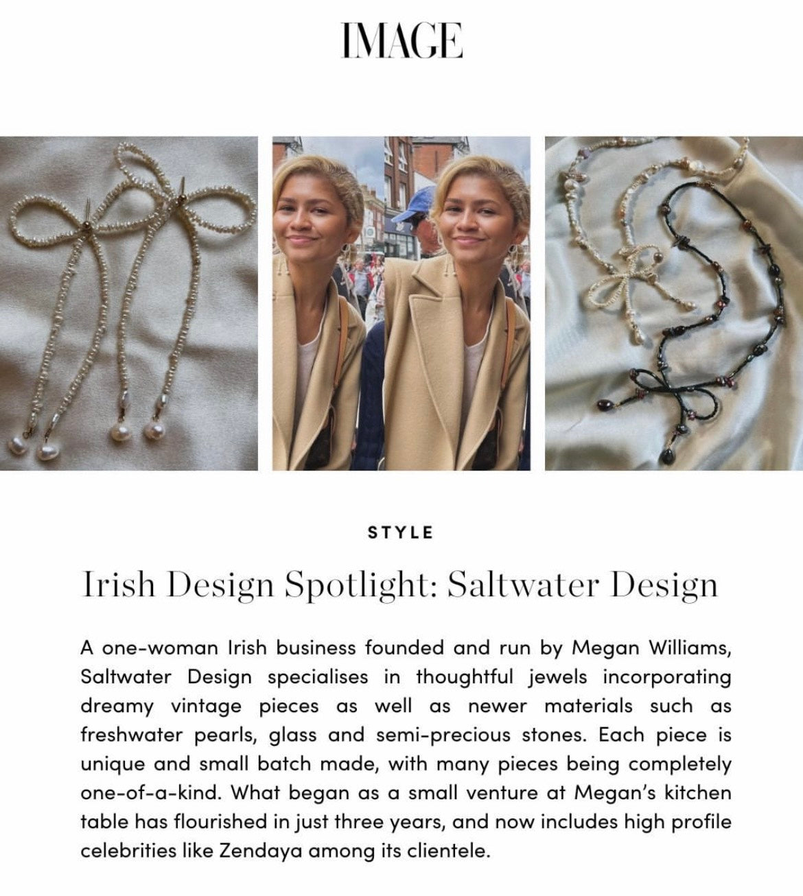 Saltwater is a labour of love combining my passion for creativity and connection. What started as a small project at my kitchen table in early 2021 has now grown beyond my wildest dreams. My most popular style, the Dream bow earrings, were recently worn by Zendaya! You can read a little bit more about my journey in the feature below.
