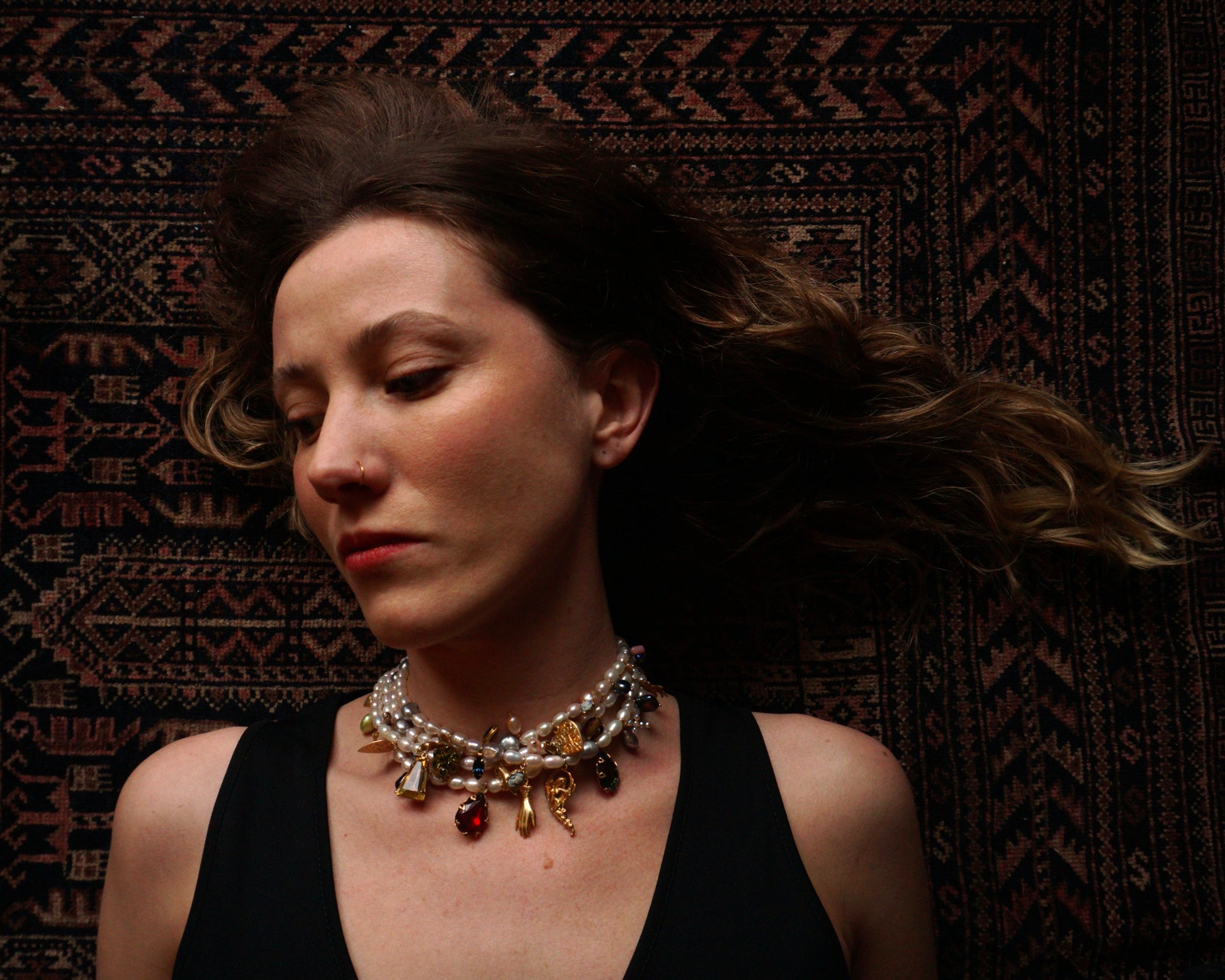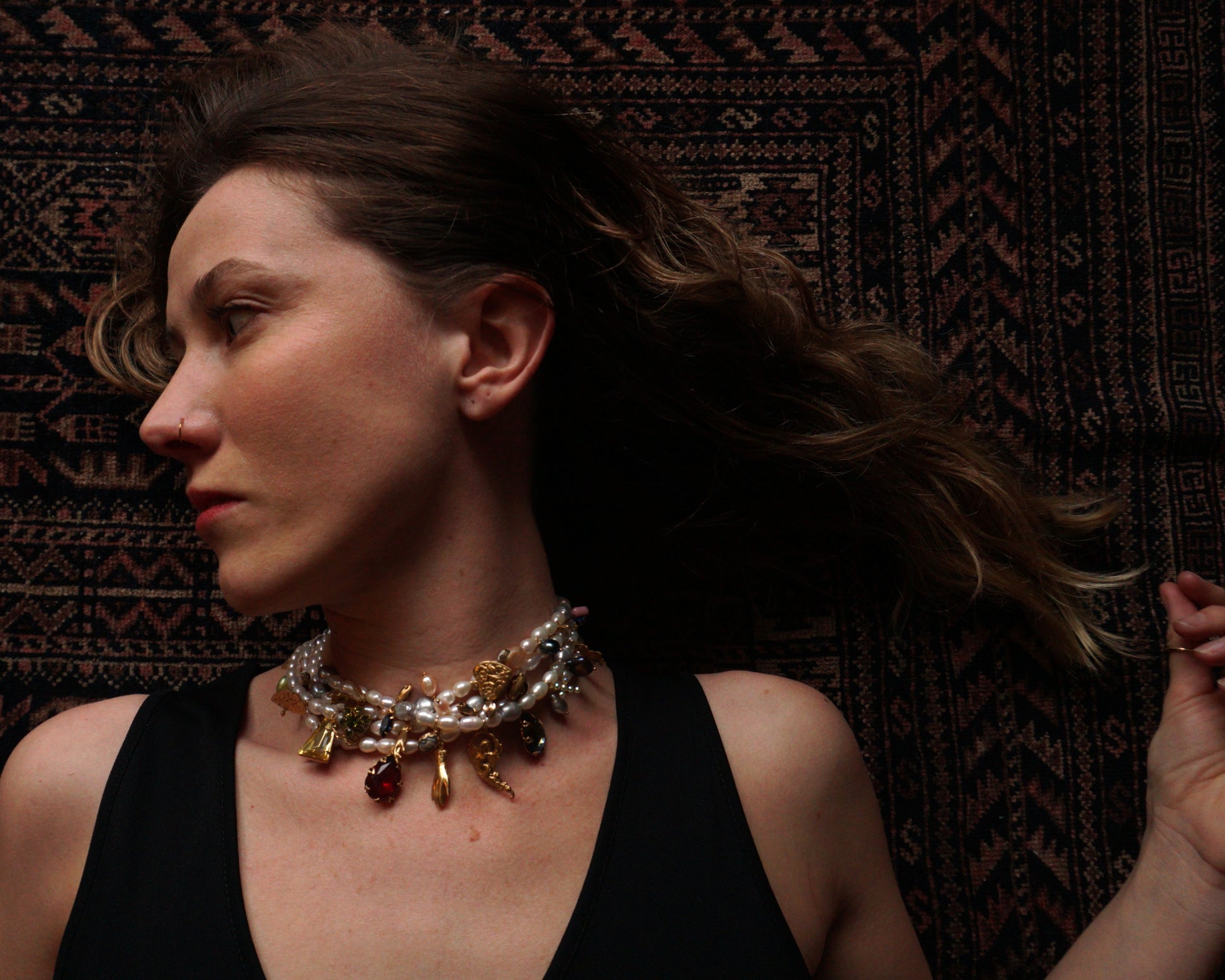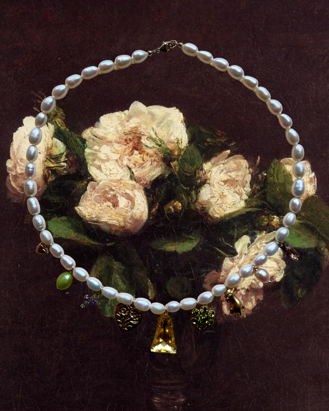 Beautiful oval rice pearls with nine carefully curated vintage charms. Finished with a gold filled clasp.