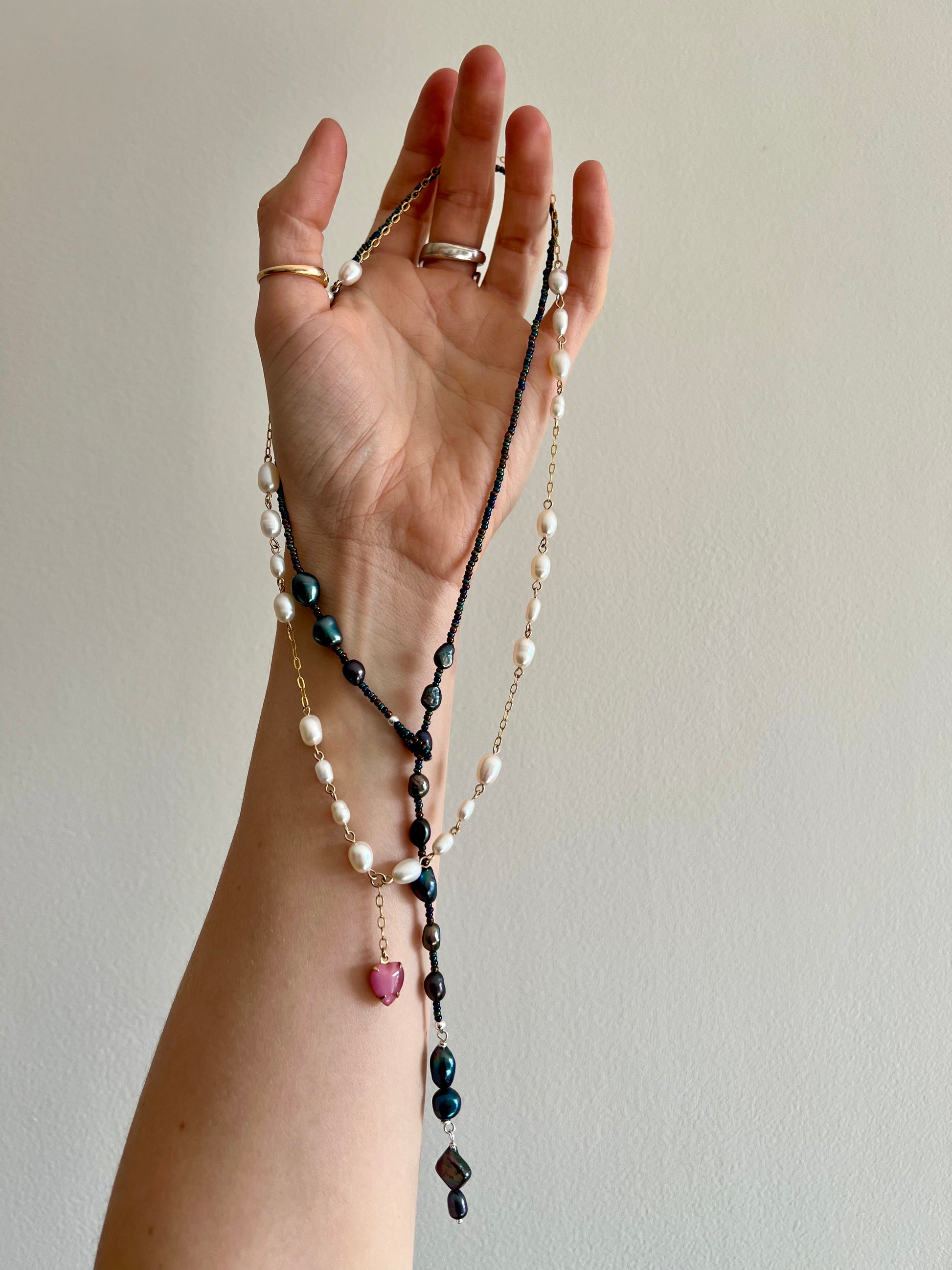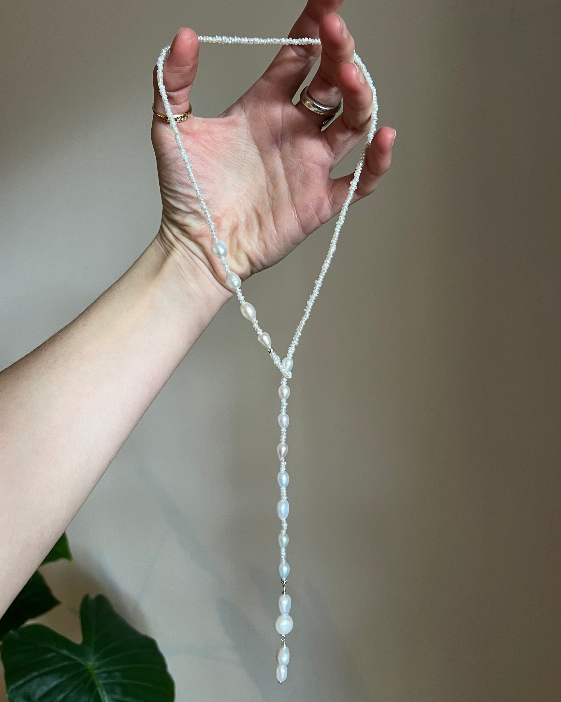 Tiny pearls in white with a small beaded loop and dangling pearls in silver or gold fill to form an adjustable lariat necklace to wear as you like.