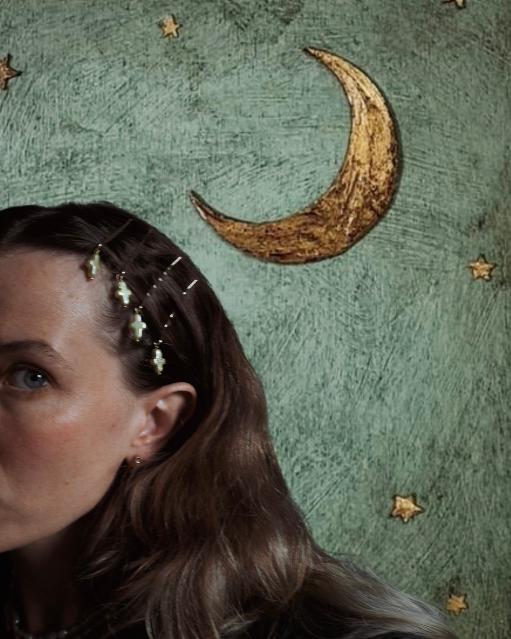 Choose between pale green crosses or plump white pearls. Fasten these onto your hair and let the small pearls fall subtly from your hair line.