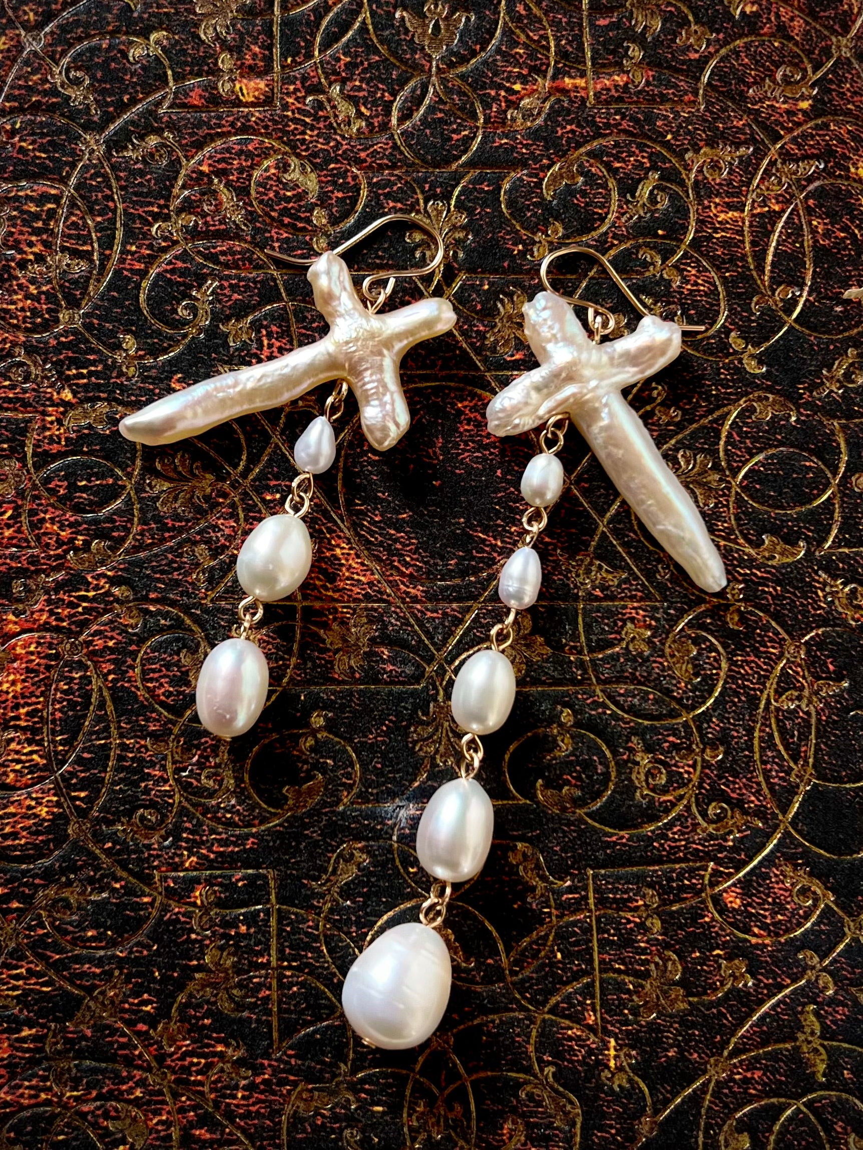 Cross pearls decorated with ascending sizes of juicy rounded freshwater pearls finished with your choice of gold filled or sterling silver hooks.
