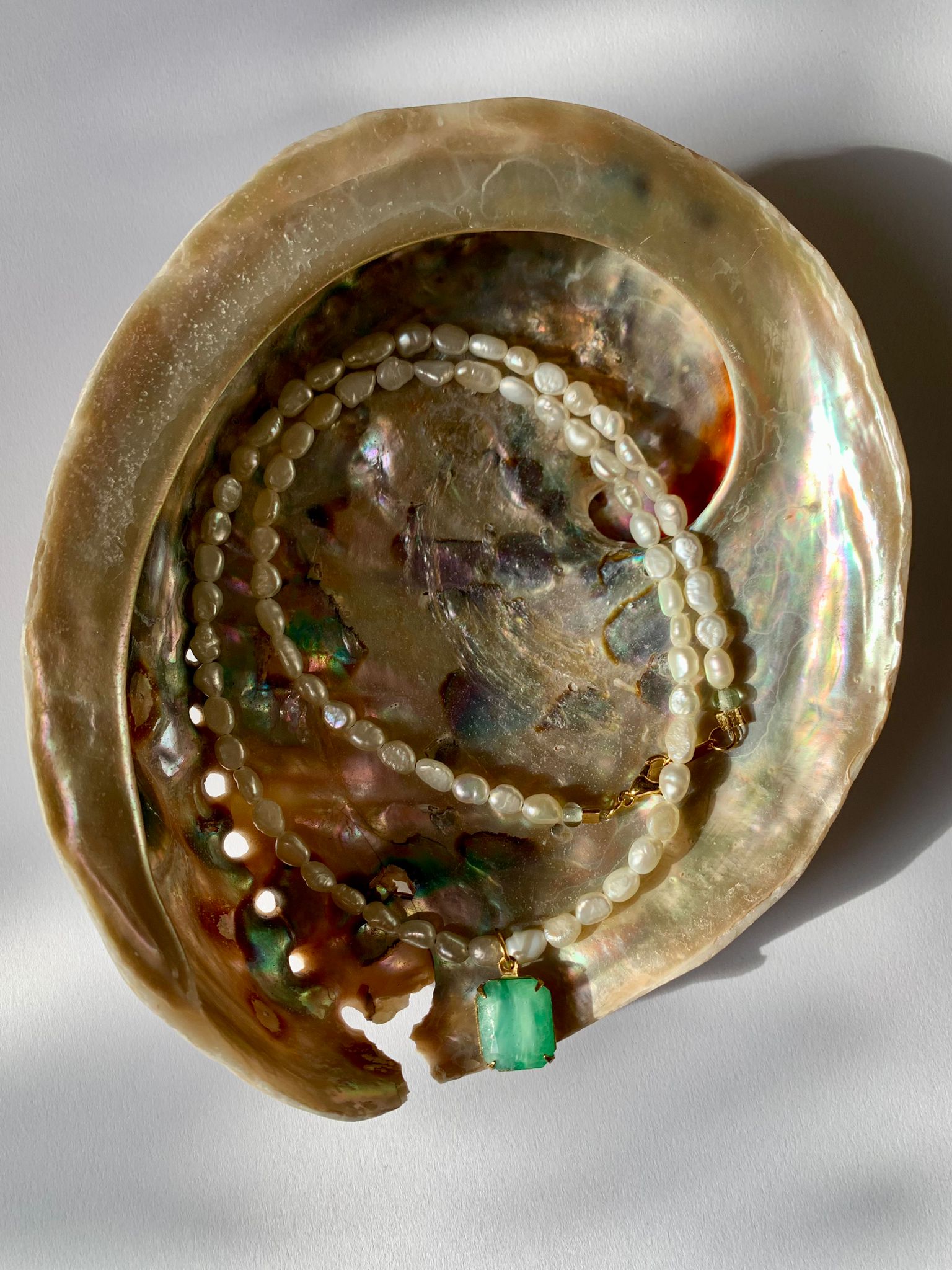 Freshwater pearls and a jade green glass pendant from the 1940s and a gold filled lobster clasp.